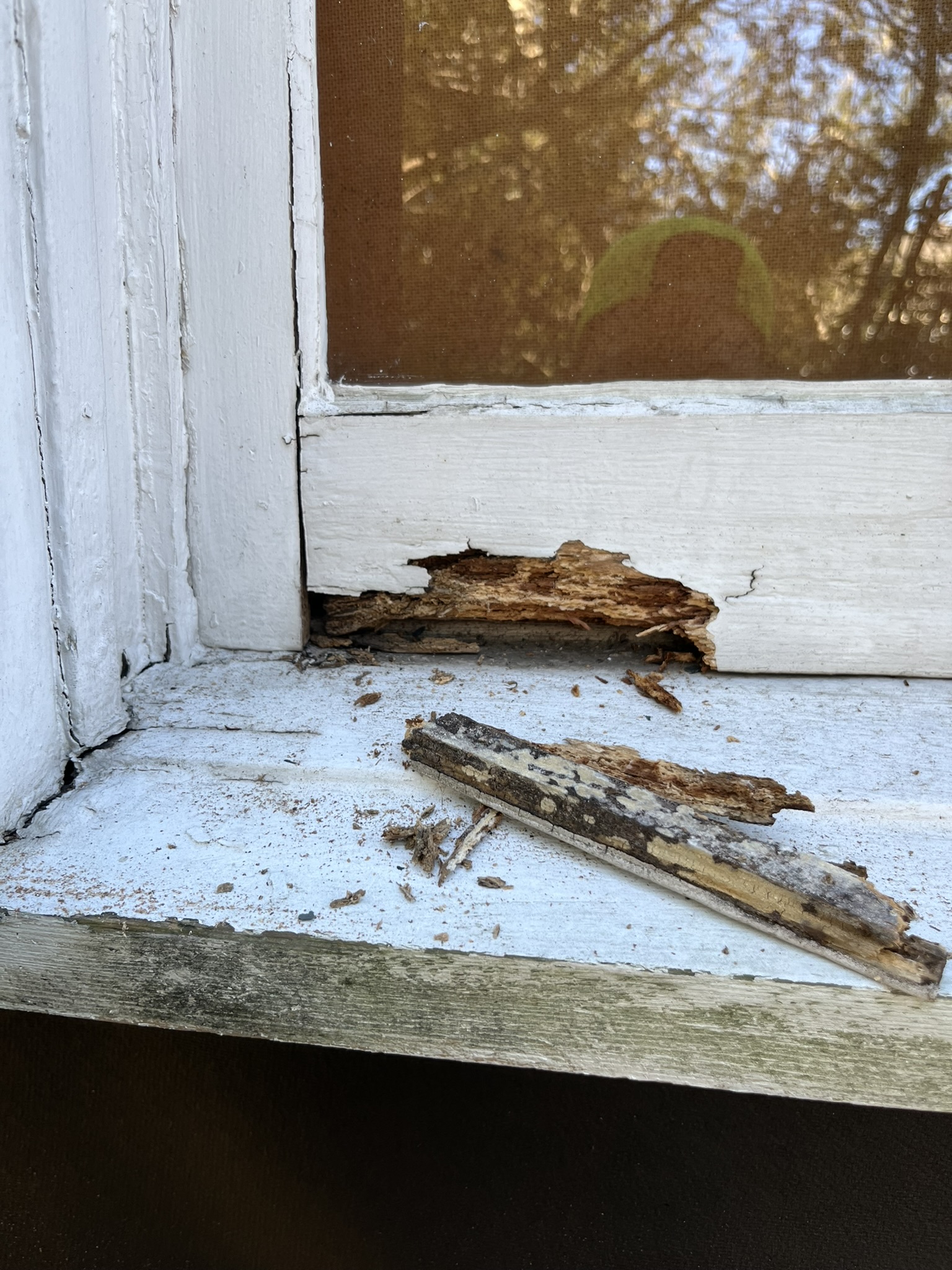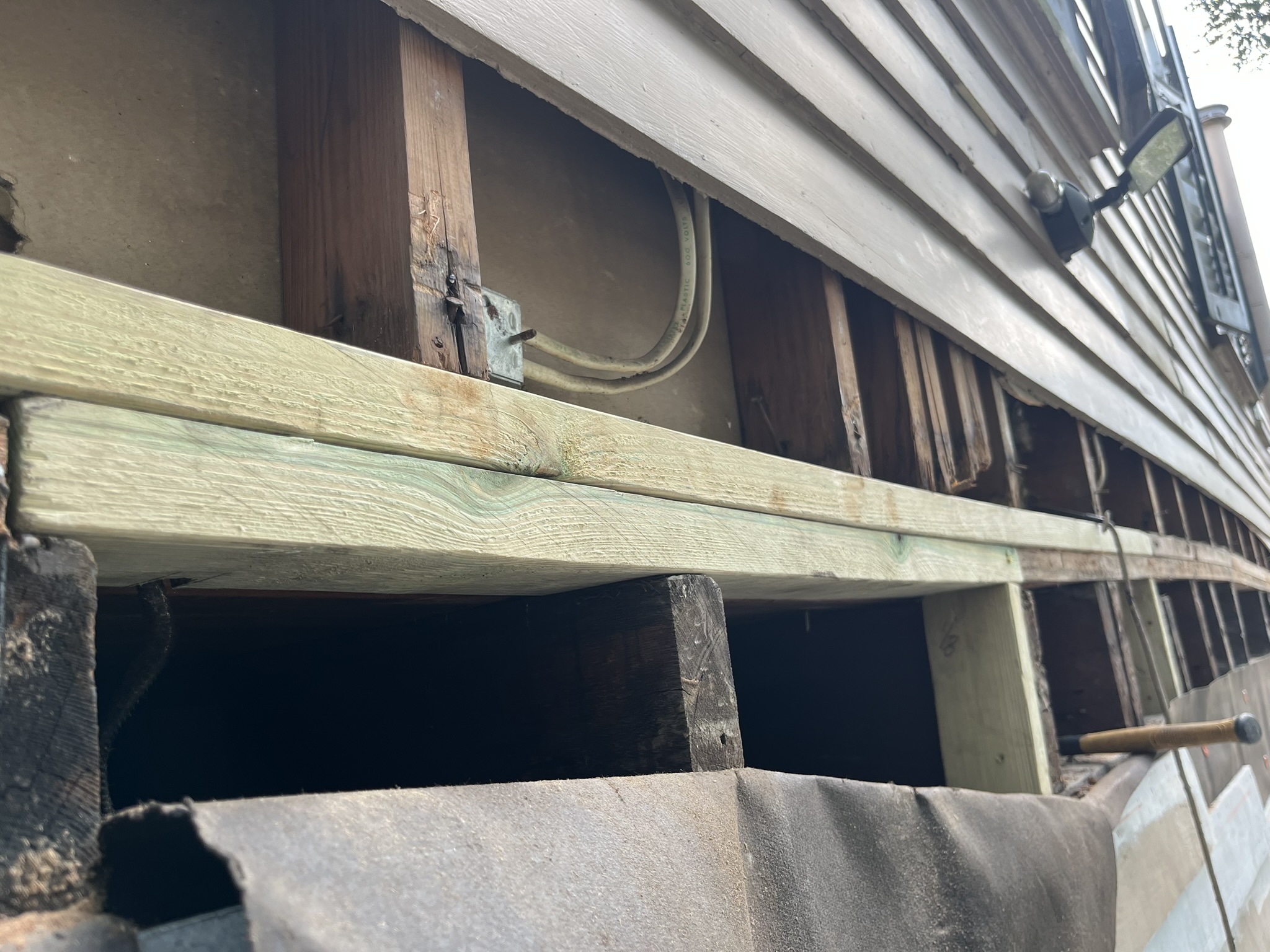 Specific structural repairs addressed areas of concentrated damage. Rotten and termite damaged sills at the right and left side elevations were replaced, and rotten corners at those same elevations were rebuilt. These targeted replacements restored proper bearing points and window support, and helped stabilize adjacent finish elements.