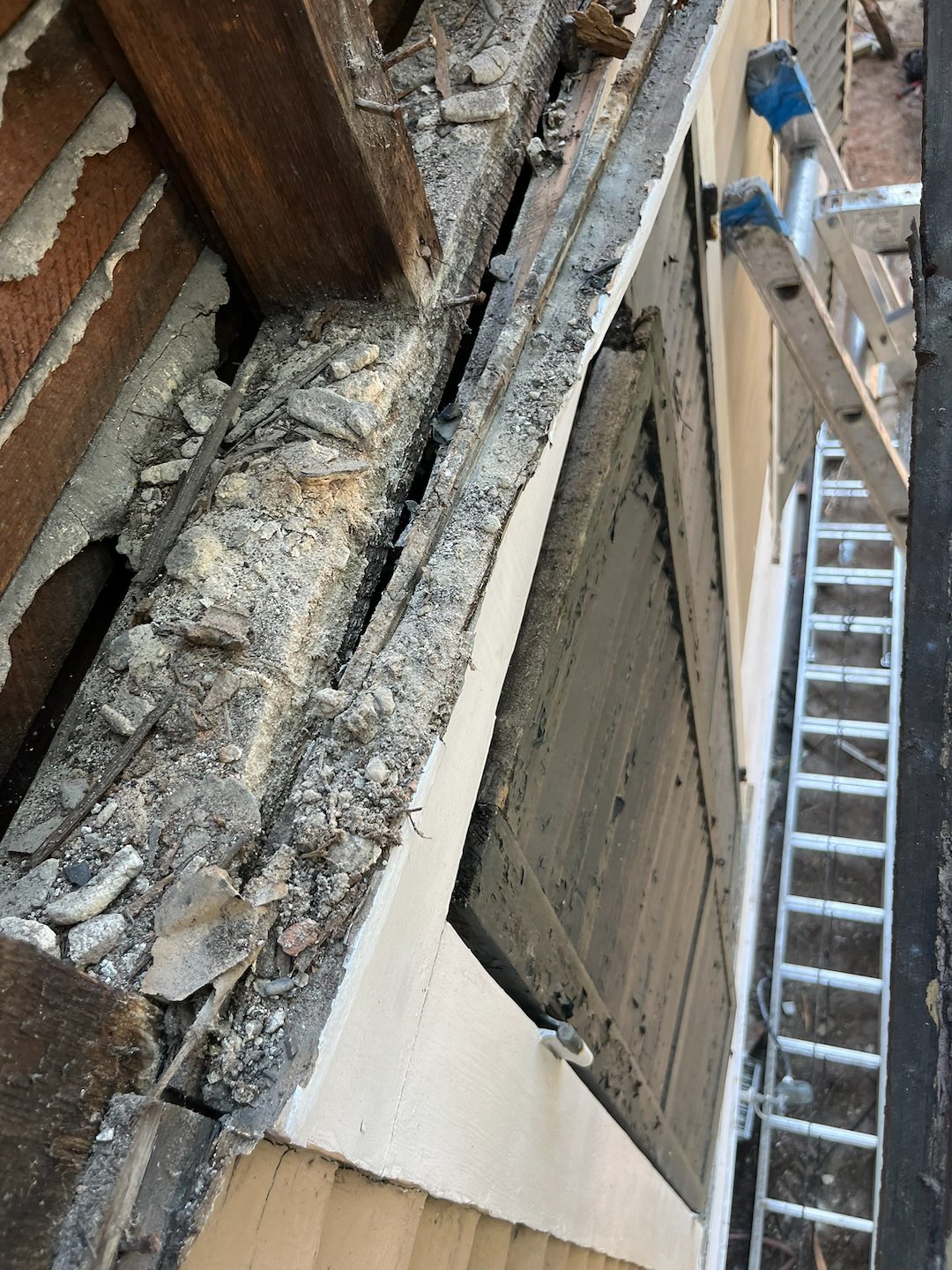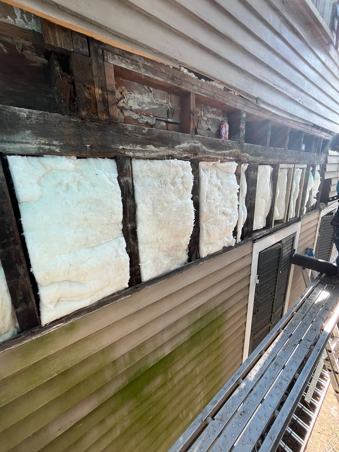 Scaffolding was set up as required to reach higher elevations and to provide safe access for detailed repairs. Damaged siding, framing, trim, insulation, and other compromised materials were removed to expose the full extent of rot and termite impact. Carefully removing only what was necessary kept the scope focused on structural and finish restoration.