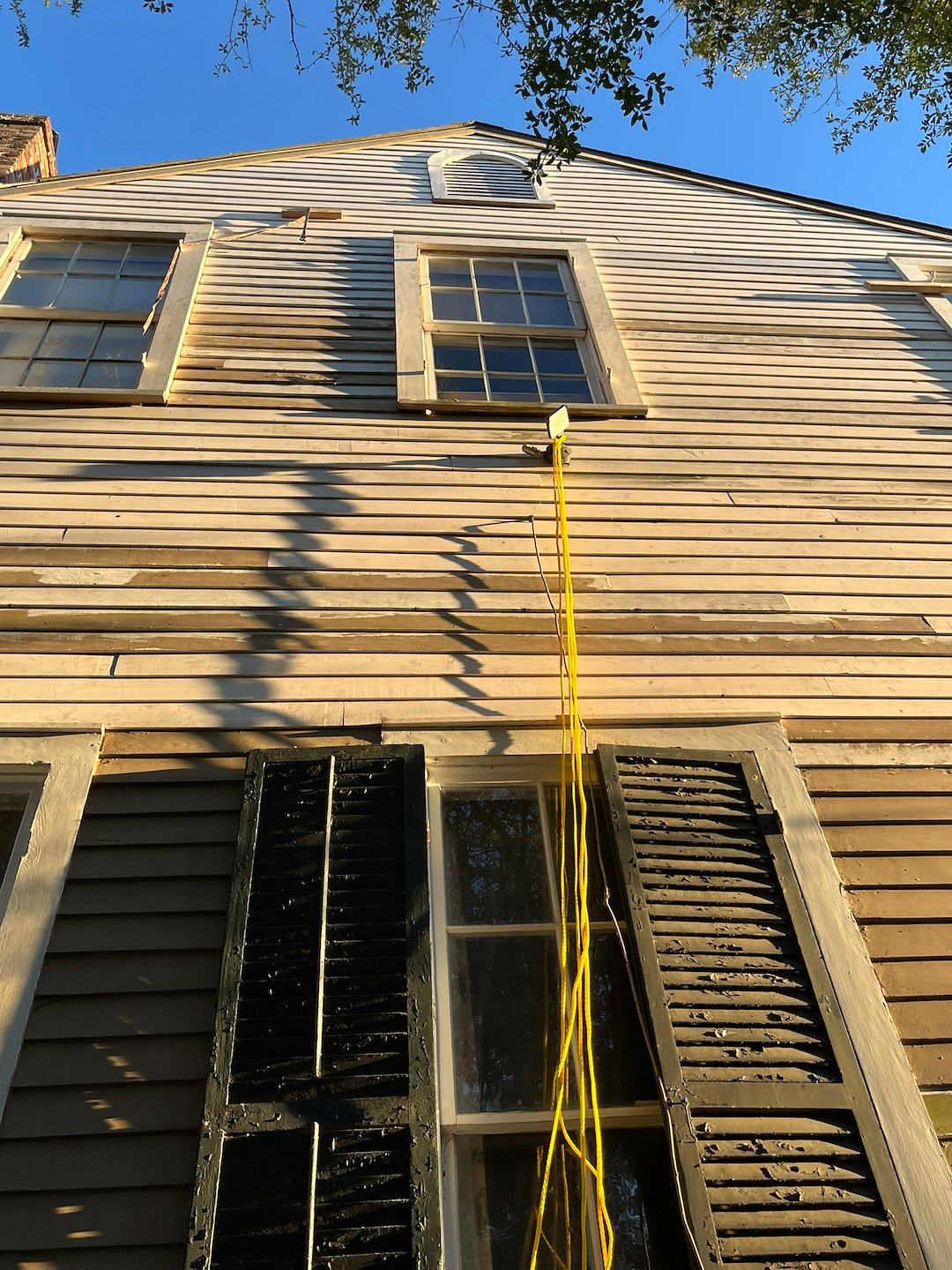Window work was a major part of the project. All window panes and glazing that could be salvaged were removed and set aside for reuse at restoration. Windows were removed and later reinstalled after repairs. Frames, sashes, jambs, and mouldings were sanded, stripped, and prepped to restore original profiles and fit.