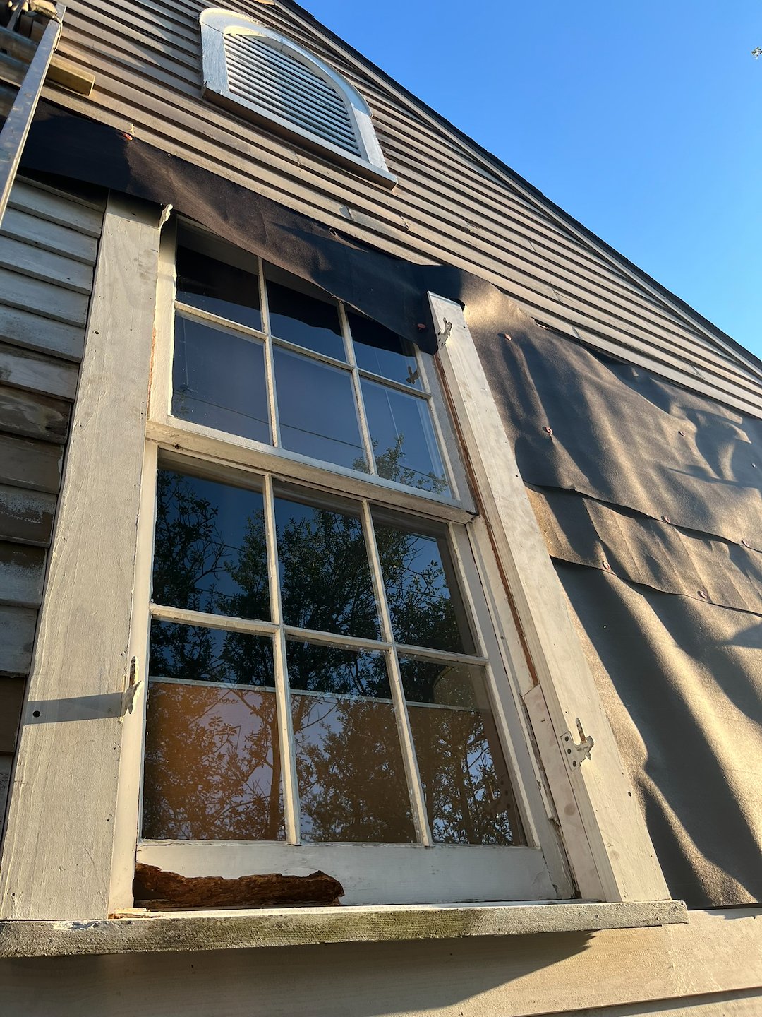 Custom fabrication played an important role in matching historic details. New mouldings, mullions, sashes, jambs, sills, and trim were fabricated to match existing profiles and installed in place of damaged pieces. Replacement work included new siding, framing, trim, and insulation where removal had been necessary.