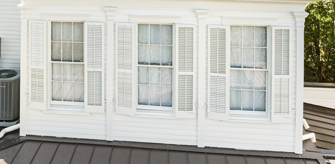 Shutters were disassembled and rebuilt as required. Restoration included sanding and stripping, custom fabricating and installing rails, louvers, and trim, Abatron repairs, and application of marine grade epoxy. Hardware was removed and reinstalled where necessary, and missing or damaged hardware was acquired and replaced as part of the project.